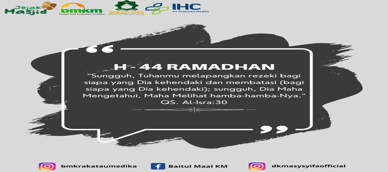 Assalamu'alaikum Sobat KM. Sob, seringkali kita merasa khawatir terhadap rezeki dan terkadang kita lupa bersyukur terhadap rezeki yang sudah kita peroleh sehingga apapun yang sudah didapatkan rasanya selalu saja kurang dan tidak pernah cukup. Padahal sejatinya Allah sudah mengatur rezeki setiap hambanya. Rezeki tidak akan tertukar. Apa yang sudah menjadi takdir kita akan menjadi milik kita. Yang terpenting kita harus senantiasa berikhtiar dan berserah kepada Allah SWT. "Sungguh, Tuhanmu melapangkan rezeki bagi siapa yang Dia kehendaki dan membatasi (bagi siapa yang Dia kehendaki); sungguh, Dia Maha Mengetahui, Maha Melihat hamba-hamba-Nya." (QS. Al-Isra:30) Bagi Sobat KM yang ingin beramal kebaikan, berinfaq/sedekah/wakaf/zakat bersama BMKM, dapat menyalurkan melalui: BSI 2300020219 an. Baitul Maal Krakatau Medika. Konfirmasi: 081219448162