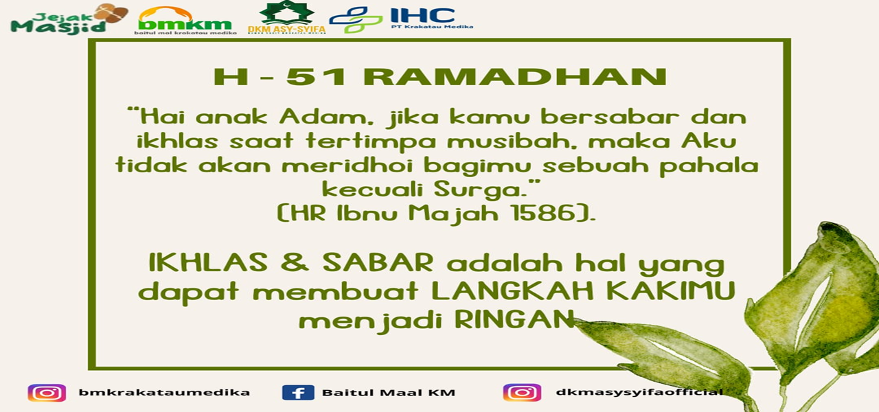 Assalamu'alaikum. Halo Sob KM, Alhamdulillah ya Sob kita masih diberi kesempatan bertemu Jumat berkah kembali. 19 hari di 2024 sudah terlewati, how's life? Hidup tak selalu mulus ya Sob, pasti dalam kehidupan yang kita jalani akan ada yang namanya kesulitan/ujian/rintangan yang akan kita temui. Ketika segala sesuatu mulai terasa sulit, membuat dada sesak, yuk kita ingat lagi bahwa Allah tidak pernah memberikan ujian diluar batas kemampuan hambanya. Ikhlas dan sabar mari kita hadirkan. Kita berdoa memohon kepada-Nya agar senantiasa diberikan kelapangan dada, diperluas kesabaran kita dalam menghadapi setiap ujian yang datang. Yakini, kita pasti bisa melewatinya karena ada Allah bersama kita. Semangat beraktivitas hari ini ya Sobat KM Bagi Sobat KM yang ingin beramal kebaikan, berinfaq/sedekah/wakaf/zakat bersama BMKM, dapat menyalurkan melalui: BSI 2300020219 an. Baitul Maal Krakatau Medika. Konfirmasi: 081219448162