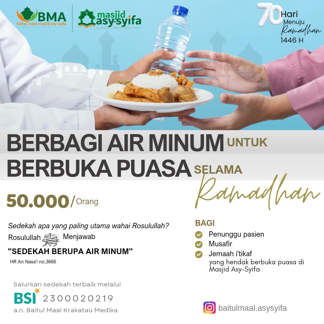 Tak terasa sebentar lagi Bulan Ramadhan tiba. Bulan yang penuh kemuliaan dan keberkahan. Pada bulan Ramadhan yang akan datang, kami mengajak Bapak/Ibu untuk berbuat kebaikan melalui Program Patungan Air Minum Buka Puasa selama Ramadhan 1446H