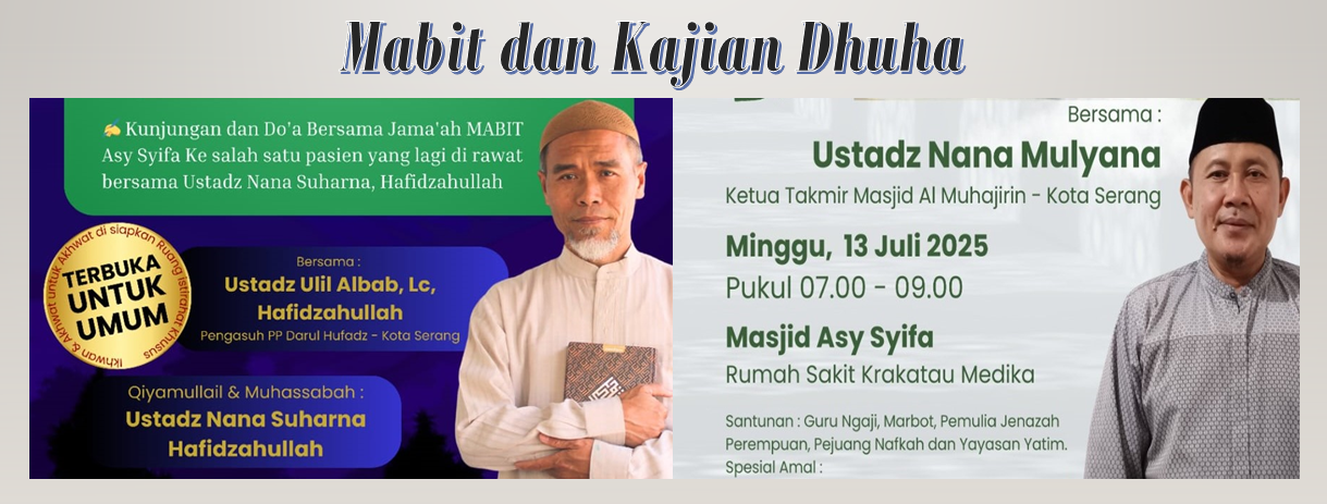 Dalam upaya memperkuat keimanan dan ketakwaan umat, Dewan Kemakmuran Masjid (DKM) Asy Syifa kembali menyelenggarakan kegiatan M.A.B.I.T (Malam Bina Iman dan Taqwa) pada Sabtu malam, 12 Juli 2025 dan dilanjutkan dengan Kajian dhuha pada Minggu pagi 13 Juli 2025. Kegiatan Mabit mengusung tema "Menghidupkan Malam dan Pengaruh dari Kekuatan Ibadahnya", yang mengajak para peserta untuk merenungi dan merasakan kekuatan spiritual dari malam yang dihidupkan dengan ibadah. Acara ini berlangsung mulai pukul 20.00 hingga 06.00 WIB di Masjid Asy Syifa, Rumah Sakit Krakatau Medika. MABIT terbuka untuk umum dan disambut antusias oleh jamaah Masjid Asy Syifa.Kegiatan ini dimulai dengan kajian utama yang disampaikan oleh Ustadz Ulil Albab, Lc., Hafidzahullah, pengasuh Pondok Pesantren Darul Hufadz – Kota Serang. Dalam tausiahnya, beliau menyampaikan pentingnya menghidupkan malam dengan dzikir, tilawah, dan qiyamul lail sebagai cara memperkokoh ruhiyah serta meraih ketenangan jiwa di tengah hiruk pikuk dunia.